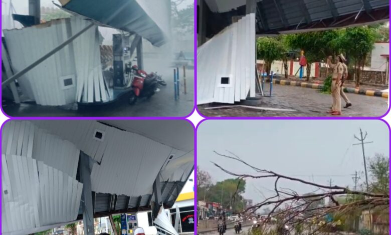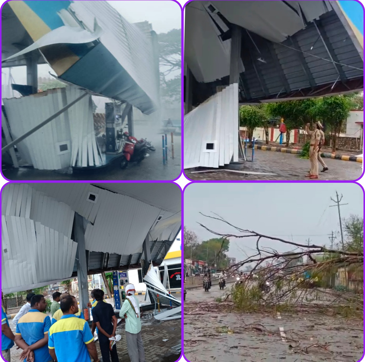 वादळी वाऱ्यासह पावसाने पेट्रोल पंपाची छत कोसळले,रस्त्यावरील झाडे पडली.