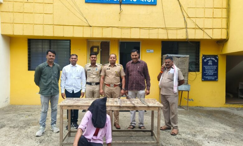 पेठ बीड पोलिसांना गुप्त माहिती मिळाली की एमआयडीसी भागात एक इसम दोन धारधार तलवारी घेऊन दहशद माजवत फिरत असल्याची माहिती मिळालीअसता.त्या ठिकाणी जाऊन तलवारी घेऊन फिरणाऱ्याला ताब्यात घेतले असता त्याचे नाव -नितीन मधुकर धुनघव वय 34 वर्षे रा.पिंपळगाव ता.केज जि.बीड ह.मु.एम.आय.डी.पेठ बीड हा दोन धारदार तलवारीसह मिळून आल्याने त्याच्यावर अवैध शस्त्र बाळगल्या प्रकरणी ताब्यात घेतल्यात आले.