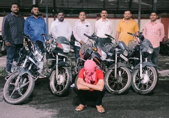 दुचाकी चोरी प्रकरणी संशयित आरोपीला शहरातील संभाजीनगर भागातून जेरबंद केले. त्याच्या ताब्यातून चोरीच्या पाच दुचाकी जप्त करण्यात आल्या आहेत. ही कारवाई स्थानिक गुन्हे शाखेने शुक्रवारी (दि.२०) केली आहे. हा जेरबंद सराईत गुन्हेगार असून त्यावर दरोड्याचे अनेक गुन्हे दाखल असल्याचे पोलिसांनी सांगितले आहे. शुक्रवारी दि.२० बालेपीर भागातील महादेव भगवान दळवे यांनी शिवाजीनगर पोलीस ठाण्यात घरासमोरुन अज्ञात चोरट्याने दुचाकी चोरुन नेल्याची तक्रार केली होती. याचा शोध घेत असताना स्थानिक गुन्हे शाखेचे पोलीस निरीक्षक शिवाजी बंटेवाड यांना माहिती मिळाली की, ती दुचाकी अतुल विक्रम वाघमारे याने चोरली आहे. तो सध्या त्याच्या रहात्या घराजवळ संभाजीनगर भागात आहे. माहिती मिळताच स्थानिक गुन्हे शाखेच्या पदकाने संभाजीनगर भागात धाव घेऊन अतुल वाघमारे यास मोठ्या शिताफीने जेरबंद केले. त्याची चौकशी केली असता त्यांने बालेपीर भागासह शहरातील विविध भागातून ५ दुचाकी चोरल्याचे कबूल केले. त्याच्या ताब्यातून चोरीच्या ५ दुचाकी पोलिसांनी जप्त केल्या आहेत. त्यास शिवाजीनगर पोलिसांच्या ताब्यात देण्यात आले आहे. अतुल विक्रम वाघमारे याच्यावर दरोड्या सारखे अनेक गंभीर गुन्हे दाखल असल्याचे पोलिसांनी सांगितले आहे.