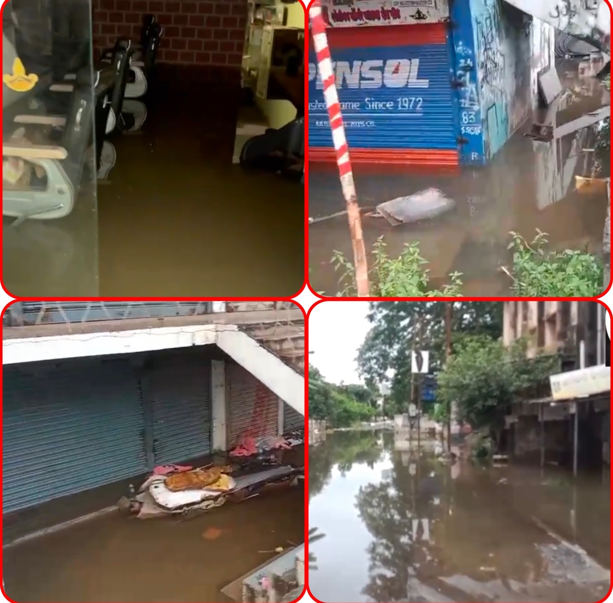 मुसळधार पावसाचा कहर–जालना रोड वरील दुकानात पाणी शिरले.