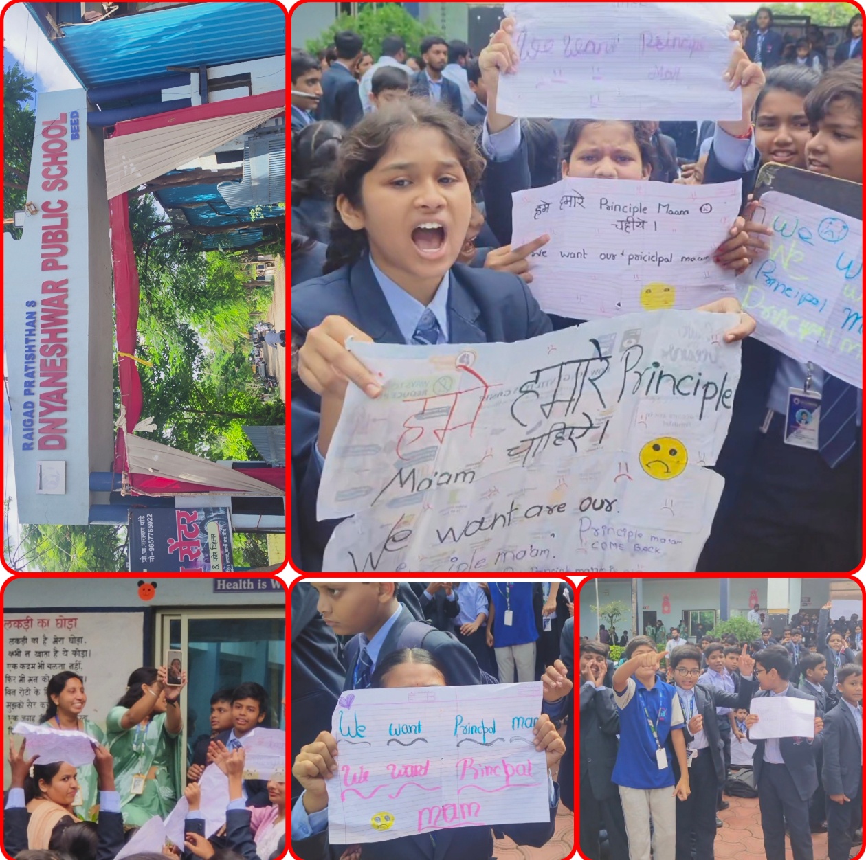 शहरातील श्री संत ज्ञानेश्वर इंग्लिश स्कूलमध्ये प्रिन्सिपल मॅडम अरोरा यांनी दोन दिवसांपूर्वी दिलेल्या राजीनाम्याच्या निषेधार्थ आज विद्यार्थ्यांनी वर्गाबाहेर बसून आंदोलन करत घोषणा दिल्याने शाळेत एकच गोंधळ उडाला.
