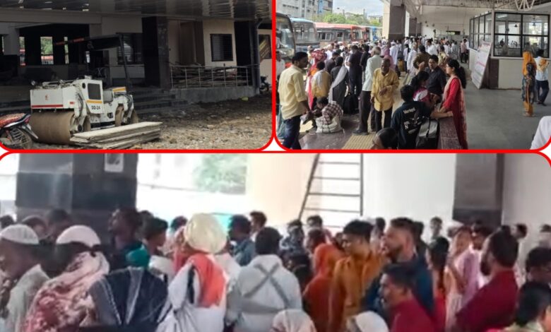 बसस्थानकात उभे राहण्यासाठी छत्रीची गरज भासत आहे,असा प्रवाशांचा संताप उसळला आहे.