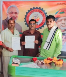 भारतीय जनता मजूर संघांचे राष्ट्रीय अध्यक्ष श्री. शांताप्रकाशजी जाटव भारतीय जनता पक्षाचे राष्ट्रीय प्रशिक्षण प्रभारी अनुसूचित जाती व जन जाती प्रमुख यांच्या आदेशानुसार भारतीय जनता मजदुर संघाचे राष्ट्रीय सचिव भाऊसाहेब घोडके यांनी प्रदेश सचिव पदी धनंजय कुलकर्णी यांची नियुक्ती केली तर मराठवाडा विभागीय सचिव पदी चंद्रकांत पाटील यांची नियुक्ती केली आहे.यावेळी असंघटित मजूर यांच्या न्याय हक्कासाठी प्रयत्न करणारी संघटना असून यासाठी राज्य स्तरावर विविध विभागाची बांधणी करून सर्व विभागाच्या मजूर व गोरगरीब लोकांसाठी काम करण्यासाठी आदेशीत केले.भारतीय जनता मजदूर संघ हा भाजपा व राष्ट्रीय स्वयंसेवक संघाच्या माध्यमातून काम करणारी संघटना असून या संघटनाच्या सर्व प्रकारच्या माध्यमातील काम करणाऱ्या लोकांना न्याय मिळवून देण्यासाठी कार्यरत आहे.औदयोगिक विभाग,सामाजिक विभाग,पत्रकारिता, सिनेमा,हॉटेल,जिंनीग कामगार,ऑईल मिल कामगार,साखर कारखाना कामगार, स्कुल कामगार,तसेच असंघटीत क्षेत्रातील सर्व कामगार अशा सर्व विभागातील कामगारांना न्याय हक्क मिळवून देण्यासाठी तसेच बांधकाम मजुरांना ज्या सुविधा सध्या मिळत आहेत त्या सर्व सुविधा इतर कामगारांना पण मिळायला हव्यात यासाठी काम करायचे आहे.यासाठी गाव पातळी पासून ते देश पातळीपर्यंत सांघिक बांधणी करत सामाजिक विकास साध्य करायचा आहे व भारताचे पंतप्रधान नरेंद्रभाई मोदी यांच्या सबका साथ सबका विकास या संकल्पनेला सार्थ ठरवण्यासाठी काम करायचे असल्याचे राष्ट्रीय चिटणीस श्री.भाऊसाहेब घोडके यांनी यावेळी बोलताना सांगितले. यावेळी श्रीनिवास केजकर,शिवराज मुथळे, संदीप भूतडा हे यावेळी उपस्थित होते.याप्रसंगी धनंजय कुलकर्णी व चंद्रकांत पाटील यांना निवडीचे पत्र देऊन पुढील वाटचालीसाठी शुभेच्छा दिल्या आहेत.त्यांचे केज अंबाजोगाई परिसरात अभिनंदन केले जात आहे..