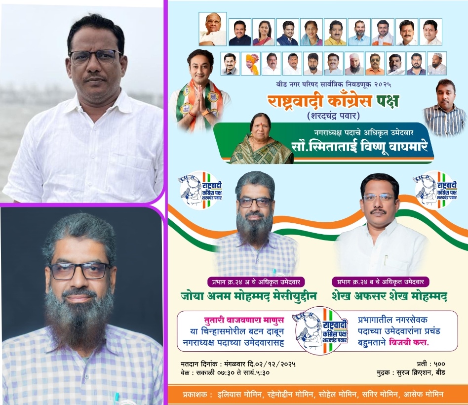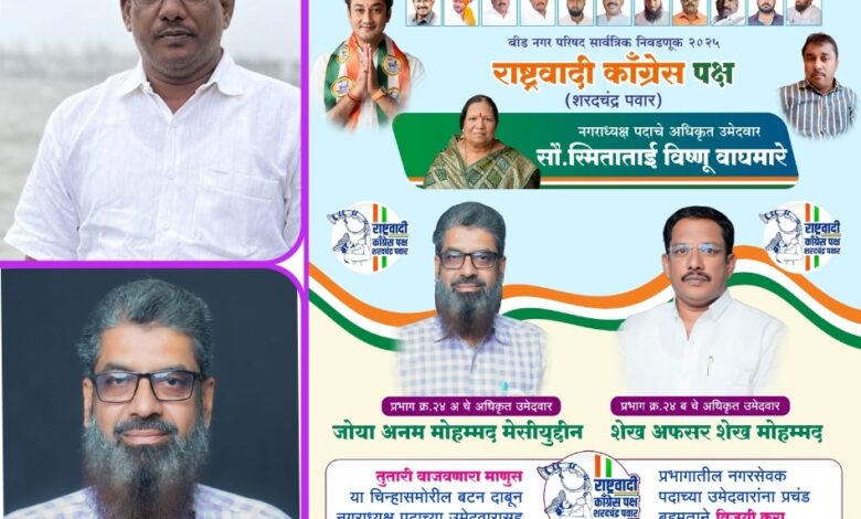 बीड(प्रतिनिधी)बीड नगरपालिकेच्या प्रभाग क्रमांक २४ मधून राष्ट्रवादी शरदचंद्र पवार गटाचे उमेदवार अफसर शेख व जोया मेसीसुद्दीन हे निवडणुकीच्या रिंगणात असून याच प्रभागातून महाकुंडे यांनी त्यांचा उमेदवारी अर्ज आज मागे घेतला.
