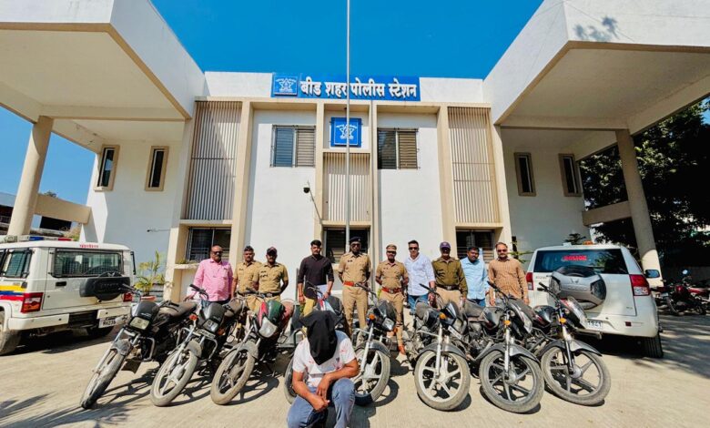 बीड शहर पोलिसांनी मोटरसायकल चोरीचे जाळे उधळले;आठ गाड्या जप्त,आरोपी अटकेत.