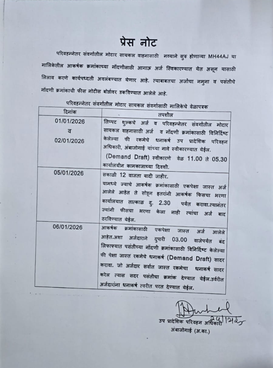 आता चालू असलेली एम एच ४४ ए एच ही मालिका संपत असल्याने आता नवीन मालिका उपलब्ध करून देण्यात येत आहे दिनांक सहा जानेवारी 2026 रोजी पासून संवर्ग वाहन 4.0 संगणक प्रणालीवर ही नवीन वाहन नोंदणी मालिका सुरू करण्यात येत आहे नवीन मोटरसायकल नोंदणीसाठी आकर्षक नोंदणी क्रमांक आता एम एच 44 ए जे या मालिकेतून दिले जाणार आहेत यामध्ये आकर्षक क्रमांक शुल्क 5000 पेक्षा जास्त असल्यास वाहन धारकाला वाहन नोंदणी क्रमांक घेण्यासाठी राष्ट्रीयकृत बँक स्टेट बँक ऑफ इंडिया बँक ऑफ महाराष्ट्र एचडीएफसी आयसी आयसीआय बँक, बँक ऑफ बडोदा चे धनादेश मतदान कार्ड बँक पासबुक लाईट बिल एलआयसी पॉलिसी जोडावे लागणार आहे हे अर्ज दिनांक एक जानेवारी 2026 तसेच 2 जानेवारी 2026 रोजी दुपारी दोन वाजेपर्यंत स्वीकारण्यात येतील त्यानंतर आलेले अर्ज घेतले जाणार नाहीत दिनांक पाच जानेवारी 2026 रोजी सकाळी बारा वाजेपर्यंत एकाच क्रमांकासाठी जास्त अर्ज आल्यास त्या क्रमांकाचा लिलाव करण्यात येईल आणि आणि त्याच दिवशी आकर्षक क्रमांक शुल्क दुपारी अडीच वाजेपर्यंत भरणा करावा लागेल त्यानंतर आलेले अर्ज बाद करण्यात येते यासाठी संबंधित क्रमांक शुल्काशिवाय बंद लिफाफ्यामध्ये धनादेश आणि बंधनकारक आहे असे उपप्रादेशिक परिवहन कार्यालय अंबाजोगाई यांच्याकडून कळविण्यात आले आहे.