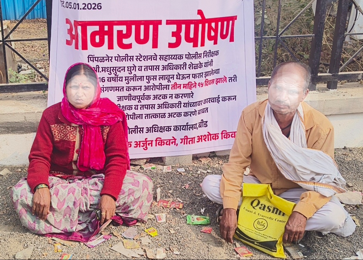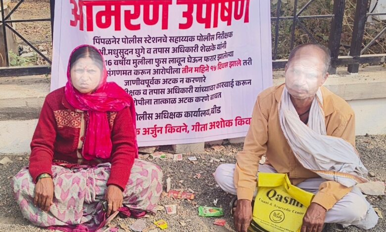 बीड तालुक्यातील पिंपळनेर पोलीस ठाणे हद्दीत साडेतीन महिन्यांपूर्वी गावातील एका तरुणाने १६ वर्षीय अल्पवयीन मुलीला फूस लावून पळवून नेल्याची घटना घडली. या प्रकरणी गुन्हा दाखल असतानाही अद्याप मुलीचा शोध लागलेला नाही. वारंवार चौकशी करूनही पोलिसांकडून उडवाउडवीची उत्तरे मिळत असल्याचा आरोप पीडित पालकांनी केला आहे. पिंपळनेर पोलिसावर रोष व्यक्त करत पोलीस अधीक्षक कार्यालय समोर पीडित मुलीचे कुटुंबीय उपोषणास बसले.